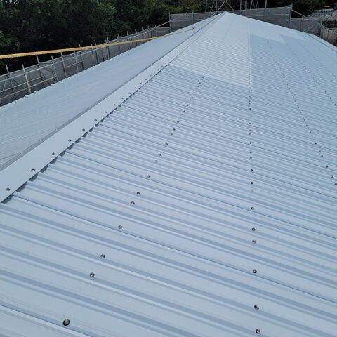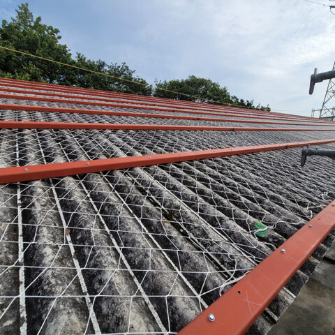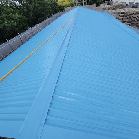 - スレート屋根の倉庫で断熱用カバー工法の工事を行いました。既存のスレートを残したまま断熱材と新しい金属屋根を重ね張りすることで、雨漏り対策はもちろん、夏場の暑さや冬場の冷え込みも軽減できる仕上がりになりました。