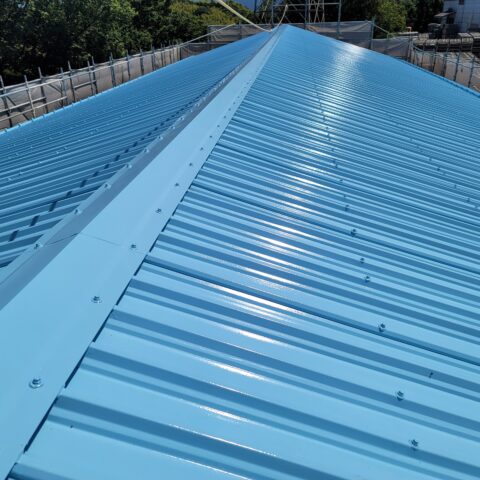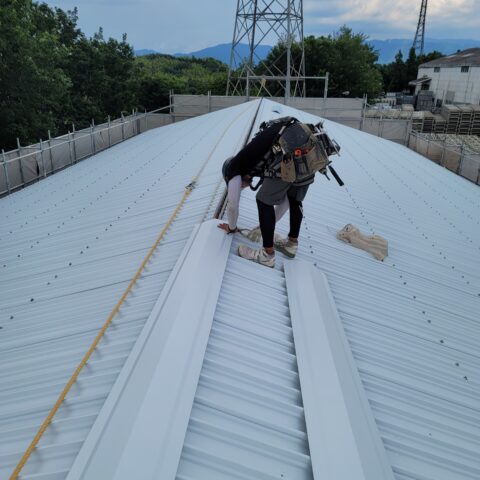 - スレート屋根の工場で断熱用カバー工法の工事を行いました。既存のスレートを残したまま断熱材と新しい金属屋根を重ね張りすることで、雨漏り対策はもちろん、夏場の暑さや冬場の冷え込みも軽減できる仕上がりになりました。